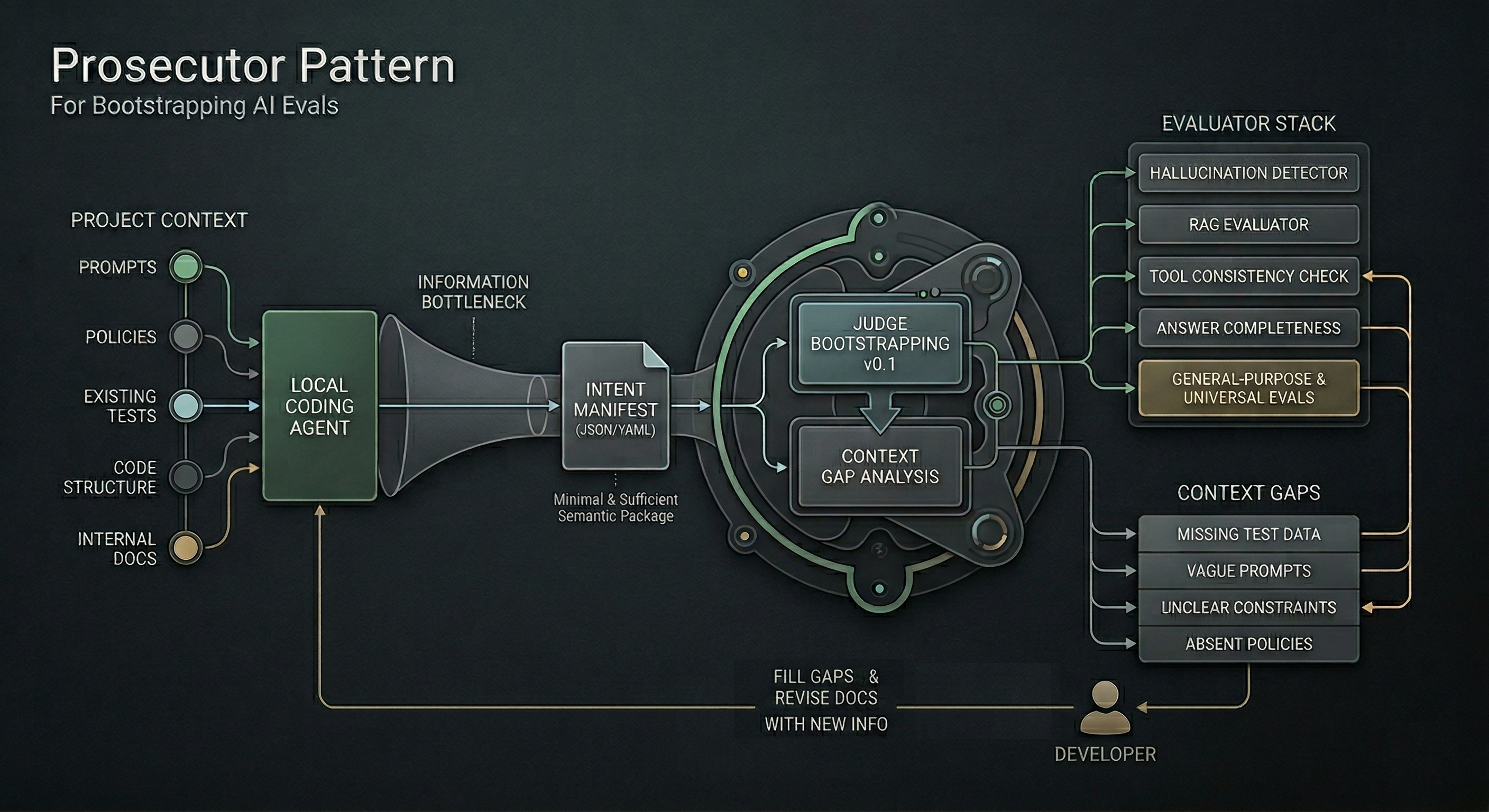 Instead of asking a human to manually define the entire evaluation stack up front, the coding agent tries to recover the intent context, build the strongest judge it can from that intent, and then explicitly report what is still missing.